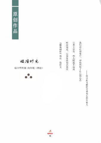 原 創(chuàng) 作 品 “ 時(shí) 世 我 翻 過 界 們 箱 境 上 活 倒 遷 總 在 柜 , 有 群 ” 心 一 體 找 情 些 中 出 卻 人 , —— 僅 碰撞時(shí)光 一 篇 是 如 隨 波 卻 始 舊 此 不 終 文 雷 逐 明 同 流 了 自 綜合管理部 向冬妮(原創(chuàng))) 己 的 心 以 意 此 文 獻(xiàn) 給 守 望 初 心 的 年 輕 人 18